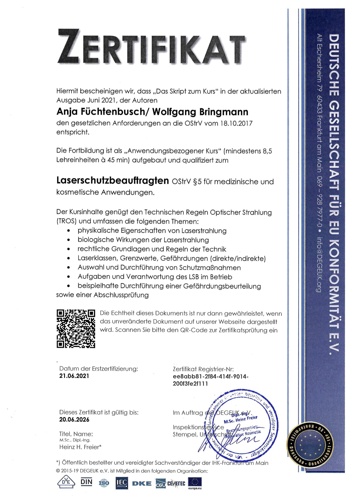 anwendungsbezogene "Zertifizierung zum Laserschutzbeauftragten" und müssen über die Sachkunde über das zum Einsatz kommende Lasergerät verfügen.